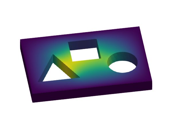 We want to solve a simple Poisson equation, but this time on a more complex domain and also including Neumann boundary conditions. Dirichlet boundary conditions are applied on $\Gamma_{\rm D}$, non-homogeneous Neumann conditions are applied on $\Gamma_{\rm N}$, and homogeneous Neumann boundary conditions are applied on the remaining portion of the boundary. The computational domains are defined in the mesh file model.msh. The domain $\Omega$ is represented by the 3D faces in this mesh. The domain $\Gamma_{\rm D}$ is represented by the physical group named "sides" and $\Gamma_{\rm N}$ is the union of the physical groups named "circle", "triangle", and "square".